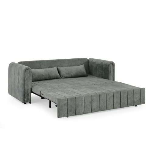 3 In 1 Pull-Out Bed Sleeper, Modern Upholstered 3 Seats Lounge Sofa & Couches With Rolled Arms Decorated With Copper Nails , Convertible Futon 3 Seats Sofabed With Two Drawers And Two Pillows