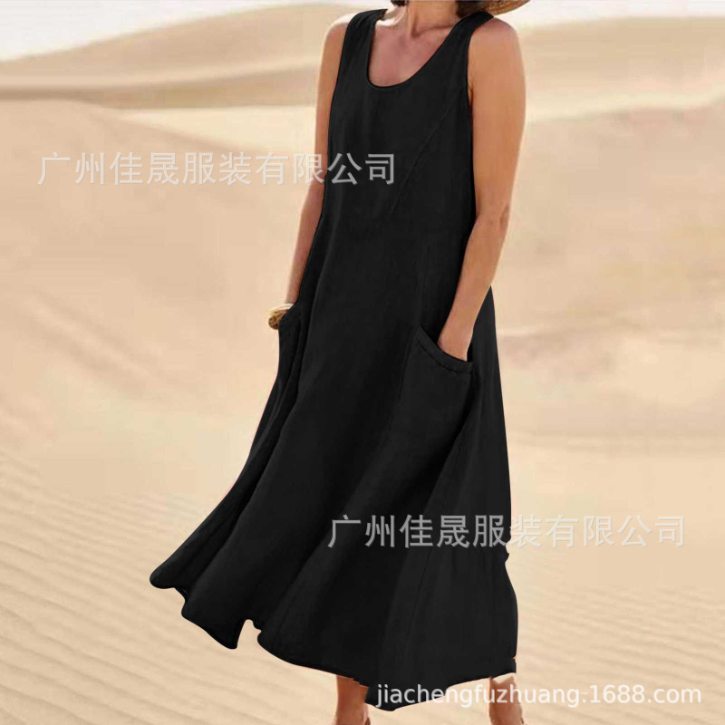 Pocket Sleeveless Round Neck Women’s Cotton And Linen Dress