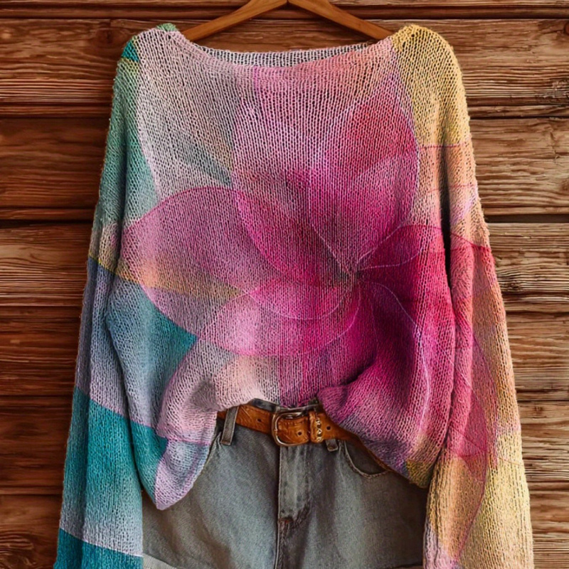 Women’s Casual Sweater – Bright Floral Print, Long Sleeves, High Collar, Loose Fit, Elegant Pullover For Fall And Winter